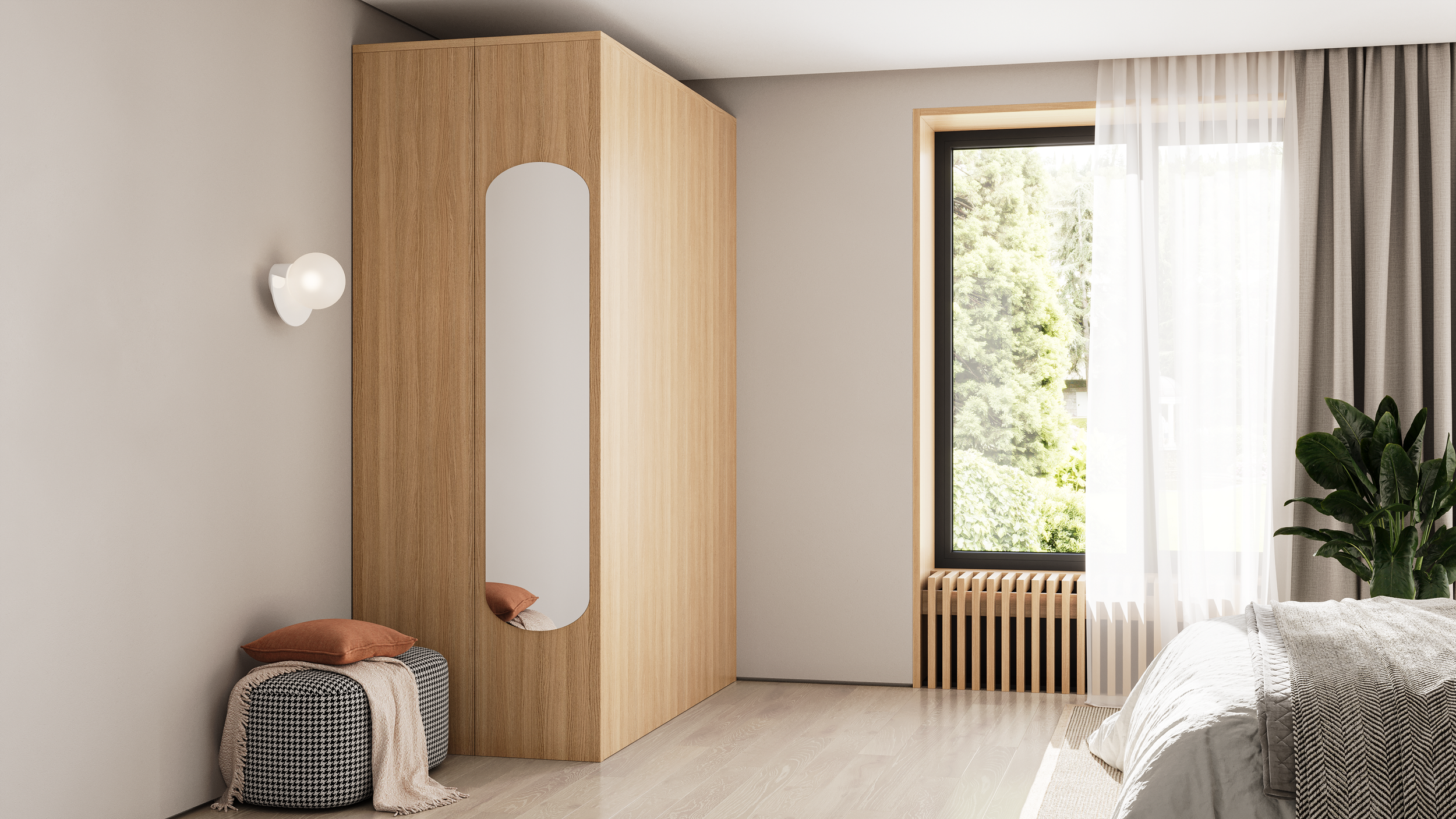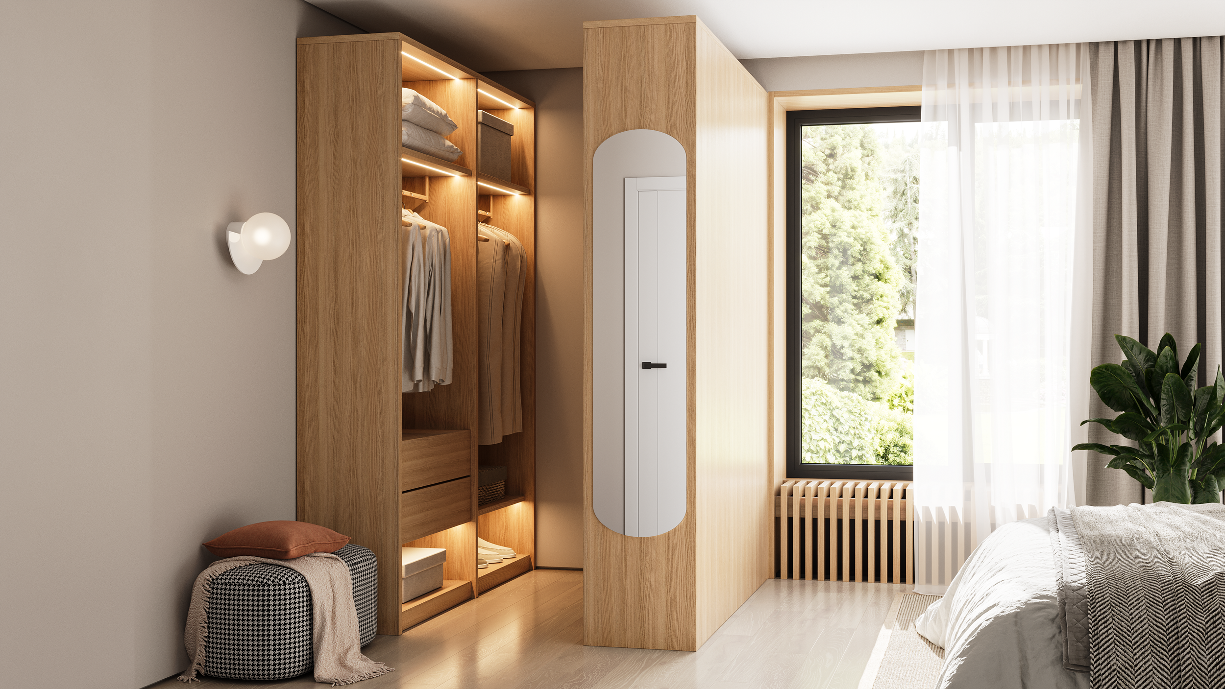An elegant wardrobe solution that reveals more space when you need it. The system consists of two integrated sections, where one wall element glides outward to create a fully accessible walk-in closet.
