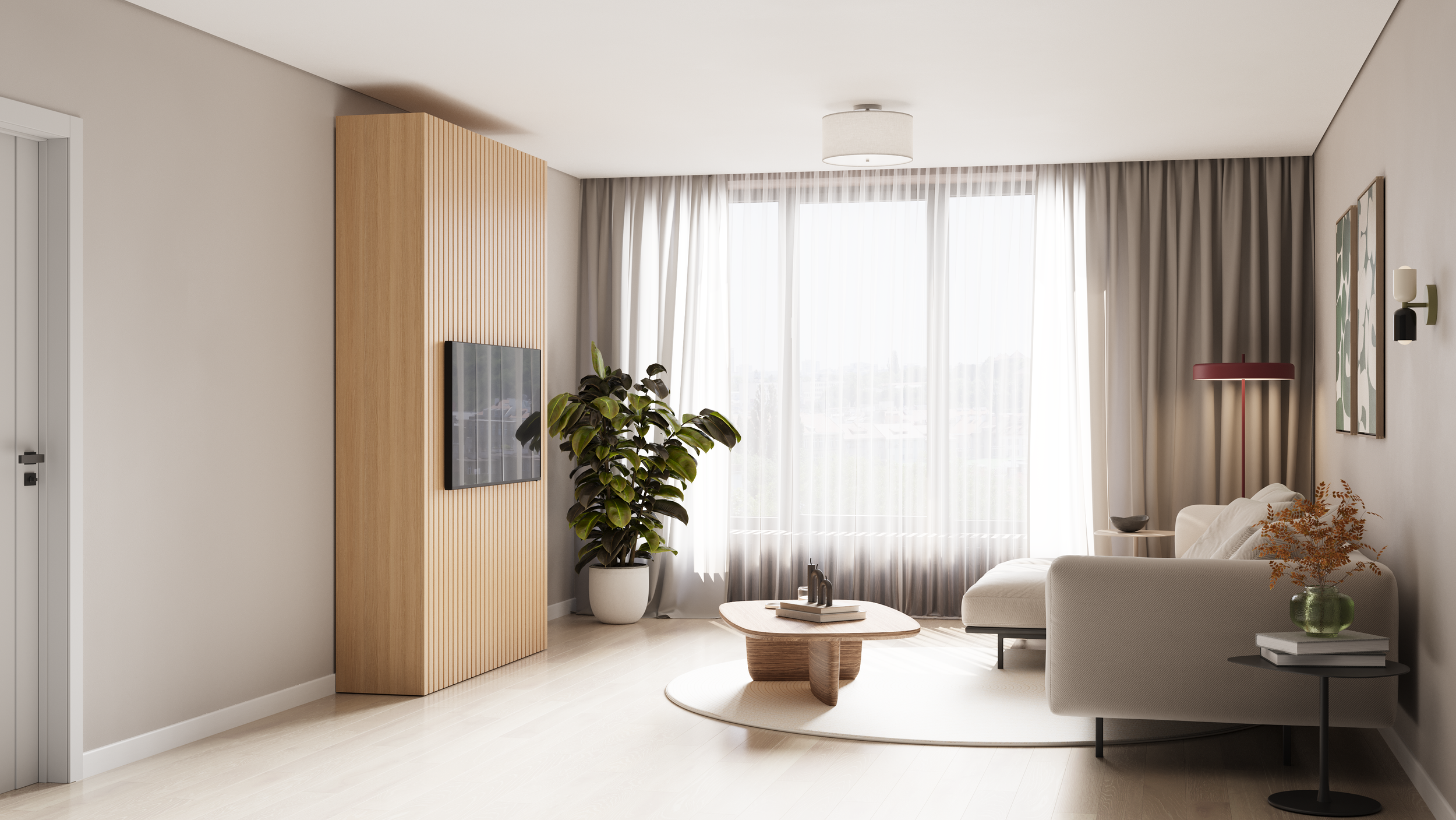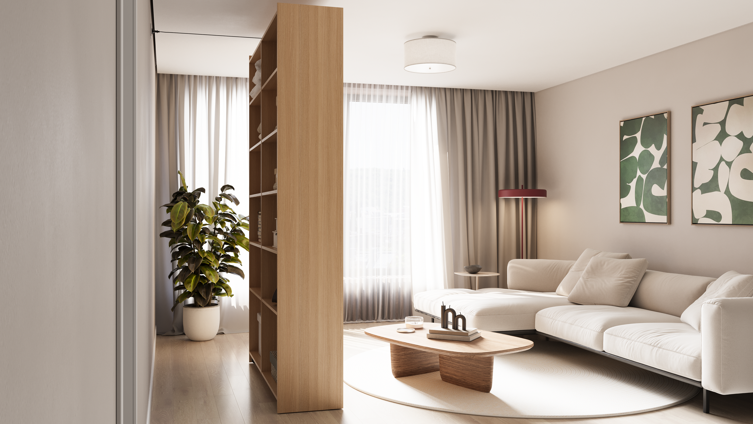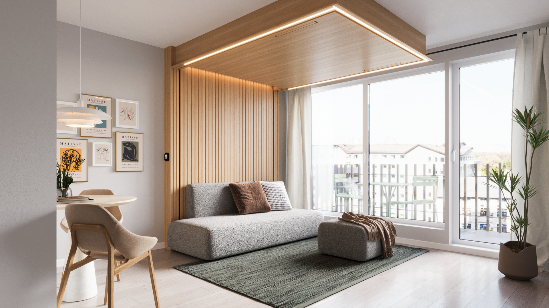 A refined living space that transforms effortlessly from lounge to bedroom in seconds. By day, a comfortable sofa invites relaxation: by night, a ceiling-mounted bed lowers smoothly to create a full sleeping environment.