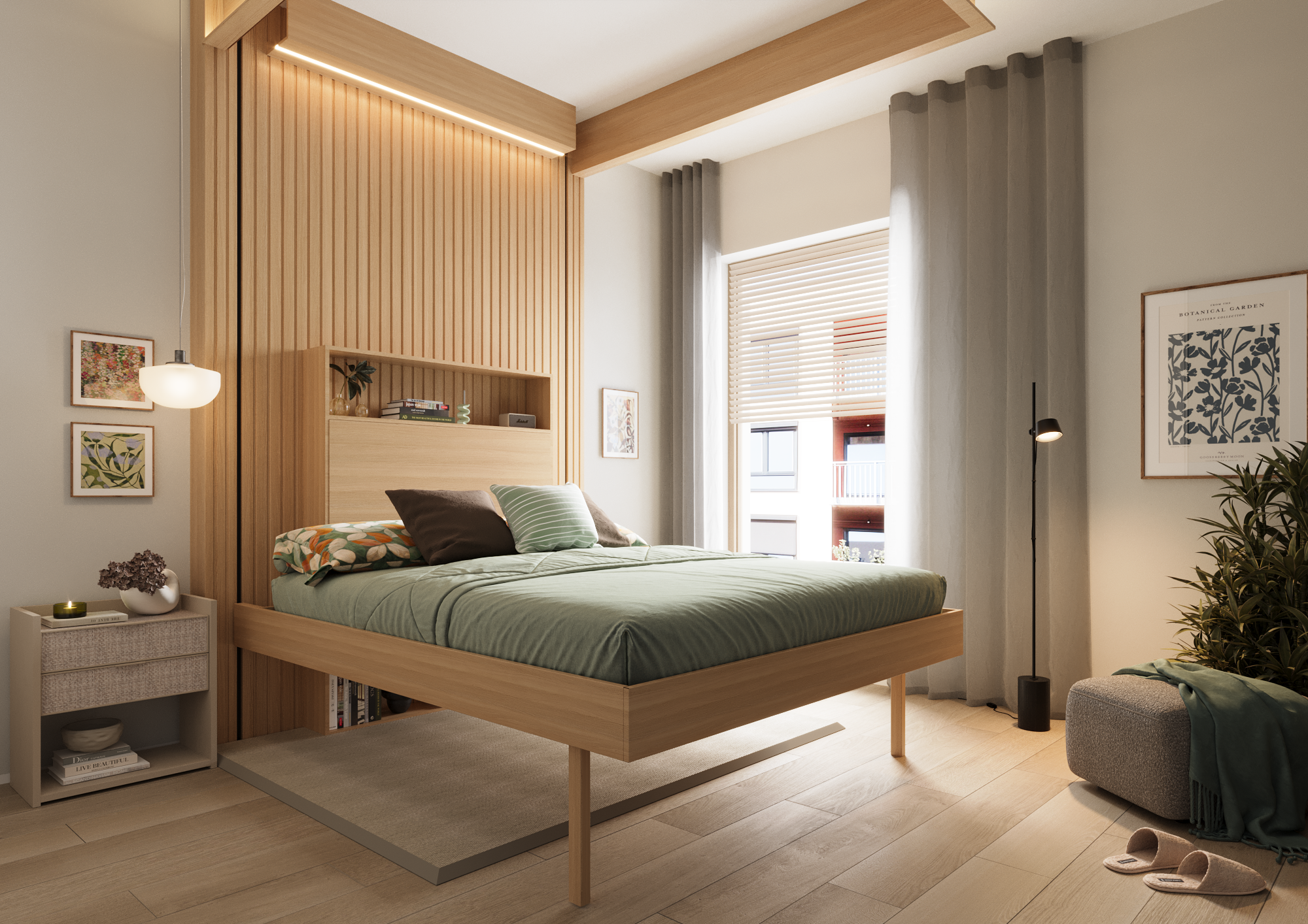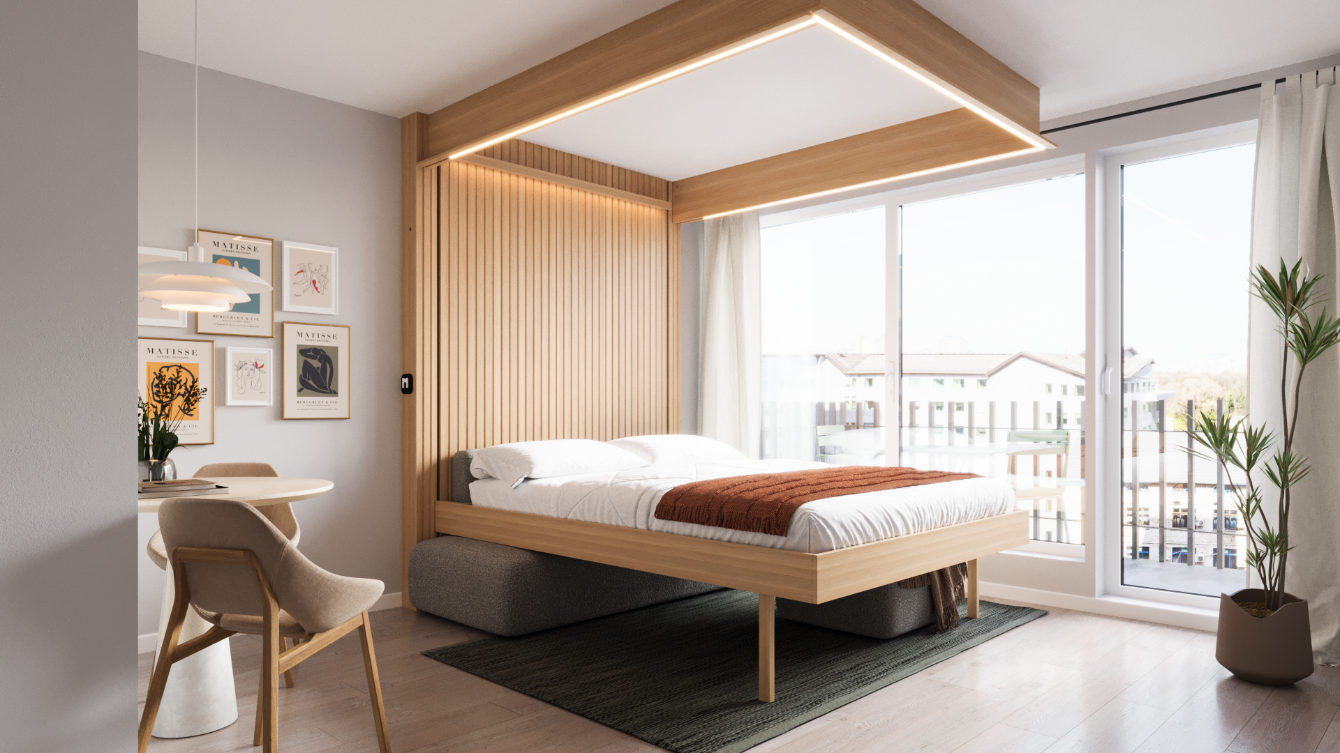 A workspace designed to adapt to the rhythm of modern living. By day, a spacious desk creates a focused and functional office environment. When evening arrives, the integrated bed descends smoothly, transforming the space into a calm and comfortable bedroom.